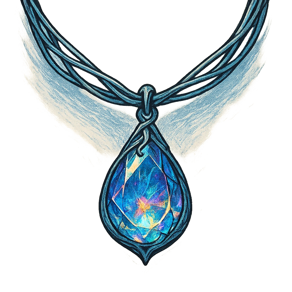 This necklace was gifted to Otto Noxley by a fairy he befriended in the forests near Pitlochry, where he grew up finding solace among magical creatures. The fairy seemed to recognize Otto’s gentle nature and deep connection to the natural world, offering the necklace as both protection and symbol of their bond.