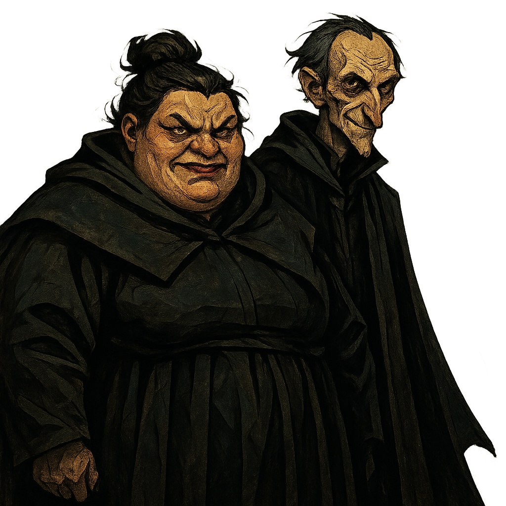 Alecto and Amycus Carrow are a brother-and-sister pair of Death Eaters known for their cruelty and sadistic tendencies. Both served Voldemort during the Second Wizarding War and were installed at Hogwarts as professors during the 1997-1998 school year — Alecto teaching Muggle Studies (rebranded as anti-Muggle propaganda) and Amycus teaching Dark Arts (replacing Defense Against the Dark Arts). They enforced discipline through the Cruciatus Curse, which students were forced to practice on those who had earned detention.
