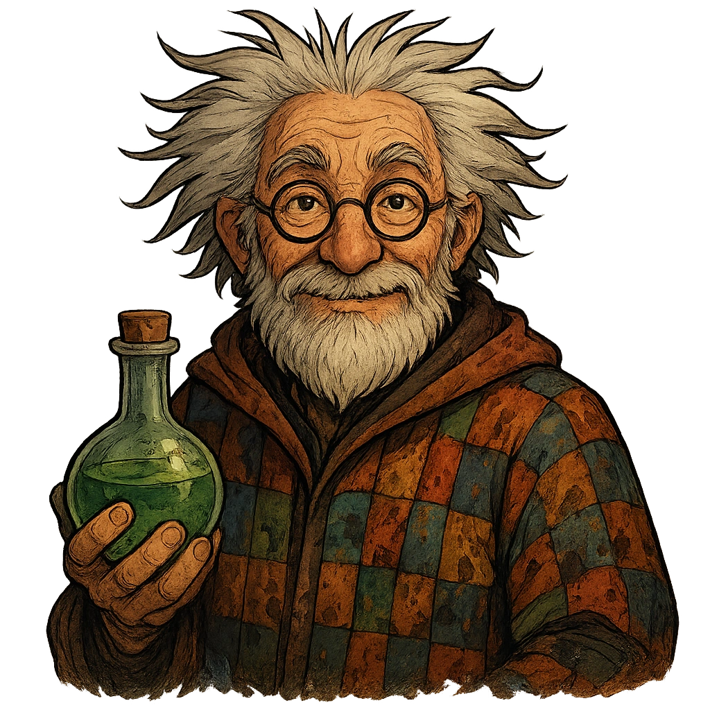 Wizzlethorpe is a wiry, owl-eyed man with wild tufts of gray hair that shoot off in all directions and thick, round spectacles often perched askew. His robes are perpetually stained with burn marks, potion spills, and mysterious discolorations, usually layered with mismatched vests and scarves.