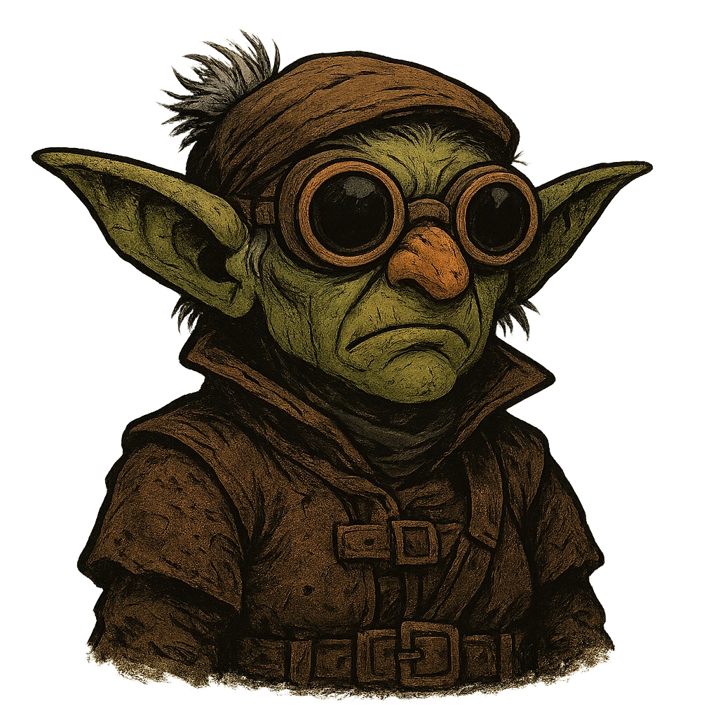 Grimbella stands just under four feet tall with the build of someone who could outlift a centaur, her dusky olive skin marked with deep creases and her wiry hair pinned under a thick canvas cap. She wears a soot-stained leather coat covered in pockets and burn marks, ever-present flying goggles, and steel-toed boots that stomp like thunder.
