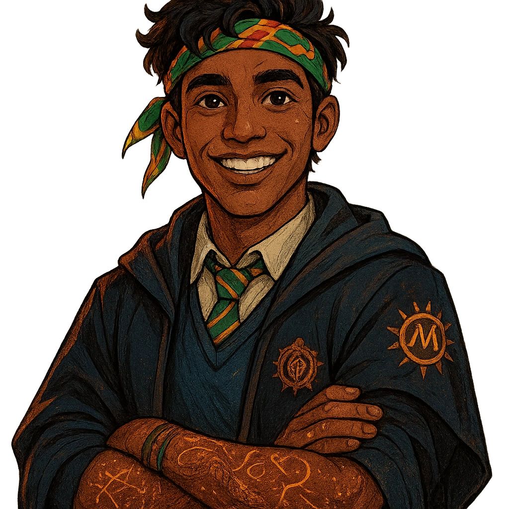 Rafael Santos is an energetic Auror in his mid-twenties with warm brown skin, dark eyes that sparkle with enthusiasm, and a bright smile that contrasts sharply with his partner Tobias Crane’s gruff demeanor. His arms are covered in magical tattoos. He wears the standard Auror robes but with a colorful Brazilian flair, often adding a charmed bandana or bracelet.