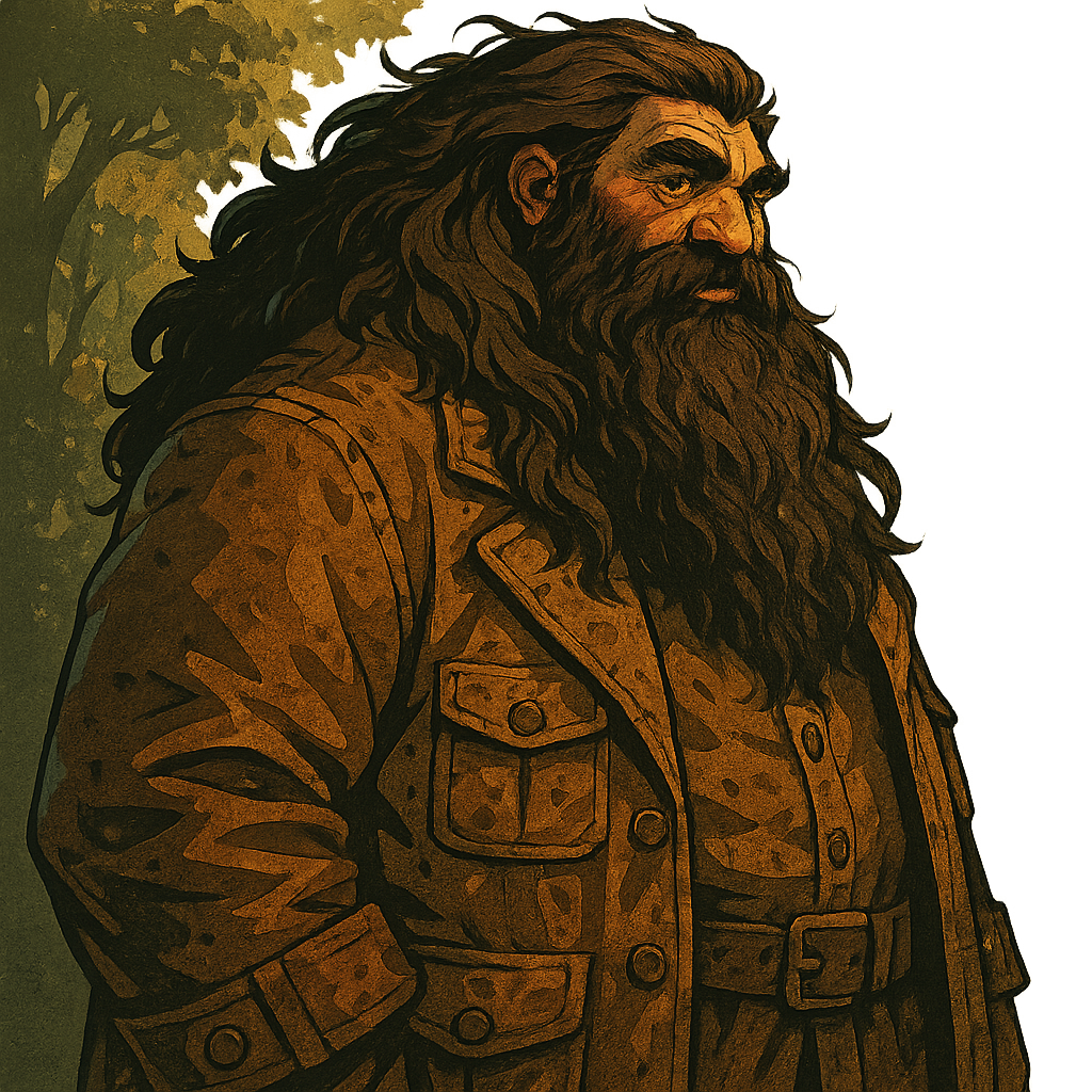 Rubeus Hagrid is the Keeper of the Keys, Gamekeeper, and Care of Magical Creatures professor at Hogwarts. A half-giant standing well over eleven feet tall with a wild mane of black hair and a tangled beard, Hagrid cuts an imposing figure — yet he possesses one of the gentlest hearts in the wizarding world. He is fiercely loyal to Albus Dumbledore’s memory and to Harry Potter, whom he carried as a baby from the ruins of Godric’s Hollow and later introduced to the magical world.