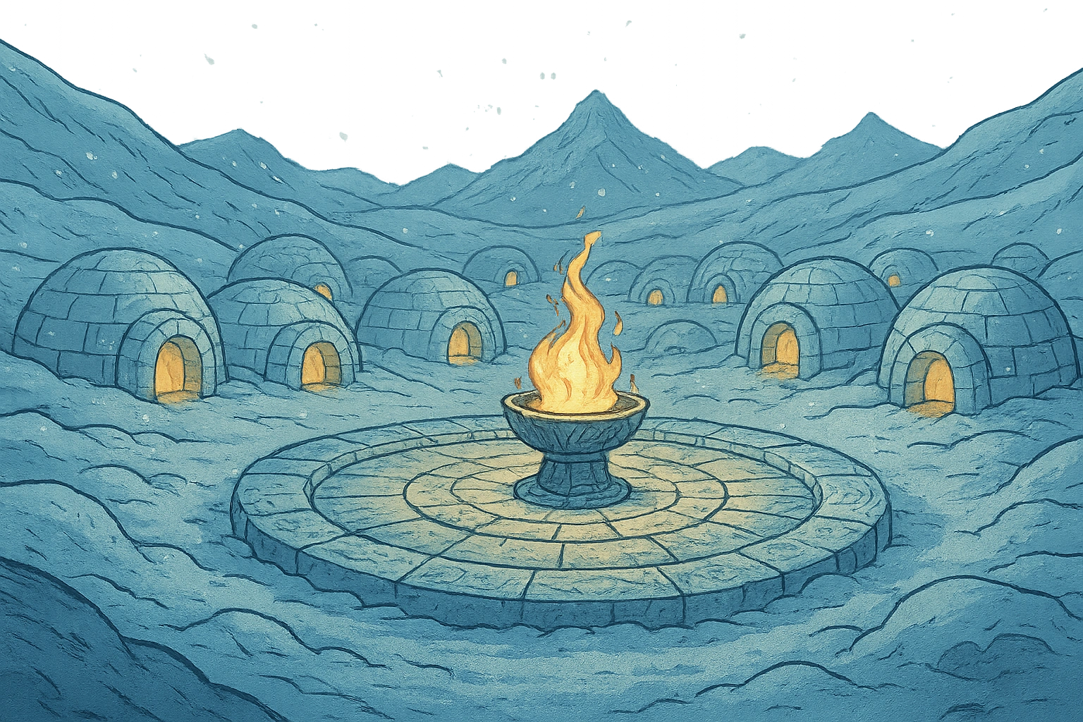 Frostwell Village is a small, remote wizarding settlement nestled in a snow-covered valley in the far north. Perfectly crafted ice igloos cluster together in the perpetual frost, their domed walls glowing softly from warm magical light within. At the heart of the village, a large ceremonial circle of ancient carved ice serves as the gathering place, while a sacred brazier burns with eternal golden flame—its warmth sustained by ancestral magic that never melts the surrounding snow.